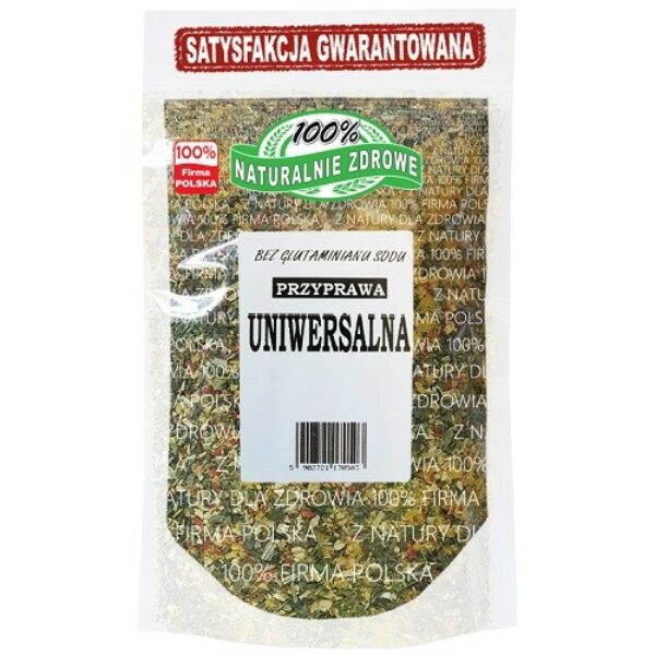 Przyprawa uniwersalna znana też powszechnie jako wegeta, warzywko czy jarzynka to specjalnie dobrana kompozycja ziół, przypraw i suszonych warzyw, która jak sama nazwa sugeruje, będzie pasować do wszystkiego. I chociaż ta popularna mieszanka stworzona jest głównie z myślą o doprawianiu zup, to nic nie stoi na przeszkodzie, by użyć jej również do lekkiego mięsa drobiowego, sosów czy zapiekanek.Przyprawa uniwersalna – składPrzyprawa uniwersalna nie posiada jednego, ustalonego składu i w zależności od producenta jej zawartość może się różnić. My zdecydowaliśmy się postawić na prostą i czystą, ale co istotne, sprawdzoną kompozycję. Co jednak najważniejsze, wykluczyliśmy również całą zbędną chemię w postaci środków konserwujących czy polepszaczy smaku.Nasza przyprawa uniwersalna to podstawa smacznej i aromatycznej zupy. W składzie prócz oczywistej szczypty soli znajdziemy suszone warzywa, jak marchew, cebula, pietruszka, por – bez tej suszonej włoszczyzny nie może być mowy o udanym rosole. Zdecydowaliśmy się nawet na dodatek pasternaku, dzięki czemu nasza mieszanka zyskuje na oryginalności i smaku.Do tego nie mogło oczywiście zabraknąć ziół i przypraw. W składzie zawarliśmy zatem popularny lubczyk, który obecny jest w wielu mieszankach przyprawowych oraz kurkumę, która nie tylko doda delikatnego i egzotycznego charakteru, ale również nada potrawie żółtawego zabarwienia.Przyprawa uniwersalna – do czego?Przyprawa uniwersalna najlepiej pasować będzie jako wzbogacenie smaku różnych zup, ale my w szczególności polecamy dodawać naszej mieszanki do rosołu i zup, które na nim bazują. Poza tym przyprawy możemy użyć do pieczonych warzyw, a także wymieszać z bułką tartą i otrzymać w ten sposób aromatyczną panierkę do mięs. Nie ma też problemu, by dodać posypki do grillowanych potraw, również ryb.Przyprawa uniwersalna – bez glutaminianu sodu?Właśnie tak! W naszej mieszance nie znajdują się żadne zbędne dodatki – nie ma chemicznych konserwantów, nie ma też sztucznych wzmacniaczy smaku jak glutaminian sodu, który jest często wykorzystywany w mieszankach przyprawowych. O ile szkodliwość samej substancji nie została potwierdzona, to w Naturalnie Zdrowe stawiamy na inne wartości - wysokiej jakości surowce oraz naturalne smaki i aromaty bronią się same!Przyprawa uniwersalna – gdzie kupić?Przyprawę uniwersalną ze względu na olbrzymią popularność można kupić praktycznie wszędzie. Nie oznacza to jednak, że łatwo będzie dostać taką bez dodatków jak glutaminian sodu. Warto wtedy pamiętać o sprawdzonych sklepach internetowych takich jak Naturalnie Zdrowe. Czysty skład, atrakcyjna cena – lepiej się nie da.Skład: sól, cukier, pasternak, marchew, kukurydza, cebula, por, lubczyk, pietruszka, kurkuma, oleorezyna kurkumy – barwnik naturalnyKraj pochodzenia: PolskaW zakładzie wykorzystywane są surowce zawierające: gluten, sezam, różne orzechy, gorczycę, seler, składniki mleka i jaj, soja.Data przydatności i numer partii towaru znajdują się na opakowaniu.Przechowywać szczelnie zamknięte w suchym i chłodnym miejscu.Opakowanie może różnić się wyglądem w zależności od partii towaru.Producent: Naturalnie Zdrowe Barbara Bućko