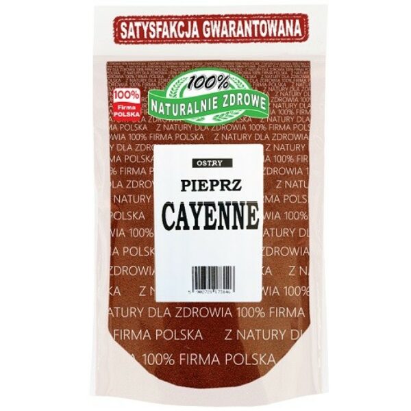 Pieprz cayenneSzacuje się, że na świecie znanych i uprawianych jest kilkadziesiąt gatunków papryki. Różnią się od siebie kształtem, kolorem i ostrością. Jedną z najbardziej znanych i popularnych, szczególnie wśród miłośników ostrych smaków, jest papryka cayenne. Z niej też pozyskiwany jest pieprz cayenne.Pieprz cayenne – właściwościPapryki cayenne to odmiana, która oryginalnie wywodzi się z regionu Ameryki Środkowej i Południowej. Od czasu odkrycia jej uprawa rozprzestrzeniła się na inne części świata i dzisiaj jest jedną z bardziej znanych i lubianych odmian. Swoją popularność zawdzięcza przede wszystkim swojej ostrości. Według skali Scoville’a, która jest wyznacznikiem ostrości, pieprz cayenne ma od 30.000 do 50.000 jednostek SHU. O ile sama wartość może nic nie mówić to porównanie do innej ostrej papryczki już tak – równie popularne jalapeno to raptem 2500-8000 jednostek, czyli wielokrotnie mniej. Za ostrość odpowiada oczywiście kapsaicyna, której cayenne zawdzięcza również swoje inne zalety.Pieprz cayenne to nie tylko pikantny smak, ale również wiele właściwości prozdrowotnych. Jak większość ostrych przypraw, pieprz cayenne ma potwierdzone działanie antybakteryjne i przeciwbólowe. Według niektórych doniesień wzmacnia również układ odpornościowy i może być pomocny w profilaktyce przeciwnowotworowej. Dodatkowo jest w stanie poprawić krążenie i obniżyć poziom cholesterolu we krwi, a także jest bogatym źródłem wielu pierwiastków z żelazem, cynkiem, potasem i miedzią na czele.Pieprz cayenne, a odchudzanieCzęsto podkreślaną zaletą pieprzu cayenne jest jego pozytywny wpływ na proces odchudzania. Jego obecność w diecie przyspiesza i usprawnia trawienie, a co za tym idzie metabolizm. Co istotne, również apetyt ulega zahamowaniu, a w połączeniu z szybszym spalaniem pozwala na uzyskanie zauważalnych rezultatów. Oczywiście, aktywność fizyczna jest również niezbędna, podobnie jak deficyt kaloryczny, ale nie ulega wątpliwości, że ostry pieprz cayenne pomaga nam w zmaganiach z nadmiarem kilogramów.Pieprz cayenne – dawkowanieZe względu na dużą ostrość pieprz cayenne powinien być stosowany z umiarem. Polecamy zaczynać od małych ilości i ewentualnie zwiększać dawki jeśli uzyskany finalnie smak będzie dla nas zbyt łagodny. Mimo swojej ostrości warto go jednak dodawać do posiłków – wzmożone wydzielanie soków trawiennych i złagodzenie wzdęć to tylko kilka zalet ostrzejszej diety.Do czego jednak najlepiej dodać pieprz cayenne? Przede wszystkim do dań wszystkich kuchni, gdzie tradycyjnie jest dużo ostrych potraw. Na myśl przychodzi od razu kuchnia meksykańska i sąsiadująca z nią teksańska, czyli regiony skąd cayenne wywodzi się historycznie. Nie oznacza to oczywiście, że nie można pieprzu cayenne używać do dań i potraw z innych części świata. Ostra przyprawa szczególnie dobrze powinna pasować do dań azjatyckich, które nierzadko mają bardzo ostry charakter.Pieprz cayenne podobnie jak pieprz zwykły może być stosowany zarówno do mięs, warzyw, sosów, makaronów, ale też jako składnik marynat czy dań jajecznych. Dobrze sprawdza się też z owocami morza. Co ciekaw, można nim też urozmaicać słodkie desery, szczególnie jeśli zawierają one w sobie gorzką czekoladę.Skład: pieprz cayenne 100%Kraj pochodzenia: Indie / ChinyW zakładzie wykorzystywane są surowce zawierające: gluten, sezam, różne orzechy, gorczycę, seler. Data przydatności i numer partii towaru znajdują się na opakowaniu. Przechowywać szczelnie zamknięte w suchym i chłodnym miejscu. Opakowanie może różnić się wyglądem w zależności od partii towaru.Producent: Naturalnie Zdrowe Barbara Bućko