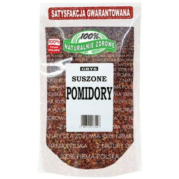 Pomidor suszony grysPomidory należą w Polsce do najpopularniejszych warzyw i są bardzo chętnie wykorzystywane zarówno w wersji świeżej, jak i suszonej. Dobrze pasują do wielu dań, można je podawać zarówno na zimno, jak i po upieczeniu. Są integralną częścią wielu sałatek, często goszczą na kanapkach, a po zmiksowaniu stanowią podstawę do różnego rodzaju sosów. Są też bogatym źródłem witamin i minerałów.Pomidory suszone na słońcu – esencja włoskich smakówPomidory suszone często kojarzą się z kuchniami południa, szczególnie włoską. Nic w tym dziwnego. Same pomidory w takiej czy innej postaci są obecne w każdej flagowej włoskiej potrawie – pizzy, lasagny, spaghetti czy sałatce caprese, a tradycja konserwowania i zabezpieczania pomidorów na zimę przez ich suszenie ma tam wieloletnią tradycję.Suszone na słońcu plastry nie tylko zachowują w sobie większość składników odżywczych zawartych w świeżych pomidorach, ale zapewniają też wyrazisty smak i aromat, podnosząc tym samym walory smakowe potraw. Cały proces odbywa się w sposób naturalny, nie są używane żadne środki chemiczne, a podczas jego trwania pomidory tracą około 90% swojej wagi – w tak skondensowanej formie są zdecydowanie bardziej wyraziste w odczuciu.Pomidory suszone – właściwościZe względu na charakter procesu suszenia, pomidory zachowują w jego czasie wszystkie witaminy i minerały. To oznacza, że nadal jest to bogate źródło witamin A, z grupy B i C, a także minerałów jak magnez, fosfor, sód, wapń i potas. Dodatkowo wysuszenie powoduje, że potrzebujemy spożyć znacznie mniej takich pomidorów, by dostarczyć podobnej ilości składników odżywczych. Suszone pomidory to także wysoka zawartość antyoksydantów, w tym likopenu – związku cechującego się silnym działaniem przeciwzapalnym i przeciwbakteryjnym, który poleca się szczególnie w profilaktyce przeciwnowotworowej.Pomidory suszone – do czego?Liczba zastosowań pomidorów suszonych w postaci grysu jest bardzo duża. Posypki możemy dodać do twarogu, by stworzyć oryginalną pastę kanapkową, ale to też prosty sposób na uzyskanie pomidorowego smaku i aromatu w zupach, gulaszach, pizzach, zapiekankach i makaronach. Mieszanka nada się też do potraw grillowanych – mięs, warzyw i owoców morza. Nawet tak proste danie, jak sałatka caprese zyska nowy wymiar, jeśli polejemy ją mieszanką oliwy i suszonych pomidorów.Pomidory suszone – cenaSuszone pomidory są dostępne w wielu sklepach stacjonarnych, ale najczęściej w postaci całych plastrów. W formie grysu występują rzadko, a dodatkowe wątpliwości może budzić ich. Nasze pomidory suszone w grysie to produkt powstały w czasie naturalnego procesu suszenia, gdzie nie były używane żadne środki chemiczne – jakość i atrakcyjna cena tylko w Naturalnie Zdrowe. Skład: zgrysowane płatki pomidora suszonego 100%Kraj pochodzenia: ChinyTabela wartości odżywczychWartość energetyczna1505 kJ / 354 kcalTłuszczw tym kw. tłuszcz. nasycone0,44 g0,06 gWęglowodanyw tym cukry74,68 g43,9 gBłonnik16,5 gBiałko 12,91 gSól0,33 gW zakładzie wykorzystywane są surowce zawierające: gluten, sezam, różne orzechy, gorczycę, seler. Data przydatności i numer partii towaru znajdują się na opakowaniu. Przechowywać szczelnie zamknięte w suchym i chłodnym miejscu. Opakowanie może różnić się wyglądem w zależności od partii towaru.Producent: Naturalnie Zdrowe Barbara Bućko