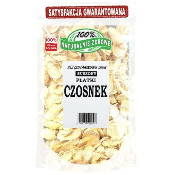 Czosnek to jedna z najczęściej wykorzystywanych przypraw w kuchniach na całym świecie. Wywodzące się z Azji warzywo znane jest od tysięcy lat i jest obecnie jedną z najbardziej powszechnie używanych roślin leczniczych ze względu na swoje liczne właściwości prozdrowotne. Stosowany zarówno na surowo, jak i w postaci proszku czy granulatu dodaje ostrzejszego smaku i aromatu wielu potrawom. Dlatego tym bardziej warto spróbować dobrze znanej przyprawy, ale w nowej odsłonie – suszonych płatków.Czosnek suszony płatki – właściwościWiele osób preferuje świeże ząbki czosnku i krojenie lub przeciskanie ich przez praskę. W taki sposób da się uzyskać charakterystyczny smak i aromat, ale niesie to ze sobą również niedogodności. Obieranie czosnku zostawia na dłoniach intensywny zapach, który potrafi utrzymać się przez dłuższy czas nawet mimo mycia rąk. Dodatkowo łuskanie i krojenie małych ząbków jest czasochłonne i niesie ryzyko skaleczenia. Można oczywiście sięgnąć także po czosnek suszony, ale to już nie to samo. Wyjściem z sytuacji i połączeniem wygody i naturalnych smaków są suszone płatki czosnku.Czym zatem czosnek w płatkach może zaskoczyć? Przede wszystkim szybkością i łatwością użycia. Plasterki po kontakcie z wodą czy inną cieczą miękną, jednocześnie uwalniając smak i aromat świeżego czosnku. Co za tym idzie, jest to świetny sposób na wzbogacenie sosów, marynat, zup czy gulaszy. Oczywiście nic nie stoi na przeszkodzie, by płatków dodać również do mięs różnego rodzaju – w takim wypadku prócz smaku, czosnek w takiej postaci będzie również pełnił funkcje estetyczne i dekoracyjne.Czosnek suszony a świeżyWiele osób uważa, że używanie świeżych produktów jest lepsze niż zastępowanie ich suszonymi wariantami. W rzeczywistości jest jednak inaczej, przynajmniej w przypadku czosnku. Pod względem właściwości zdrowotnych czy zawartości witamin i składników mineralnych nie ma znaczenia, czy wybierzemy świeże ząbki, czy suszone płatki. Proces suszenia nie pozbawia czosnku jego istotnych wartości, zmienia co najwyżej jego formę – na wygodniejszą.Jedyną różnicą między czosnkiem świeżym i suszonym jest zapach, który w przypadku płatków czy granulatu będzie po prostu odrobinę słabszy. Mniej intensywny aromat można traktować jako zaletę lub wadę, ale trzeba też podkreślić, że decydując się na suszone płatki, zyskujemy coś jeszcze – brak nieprzyjemnego oddechu. Pod tym względem świeży czosnek jest na przegranej pozycji i jeśli planujemy posiłek w bliższym gronie i zamkniętym pomieszczeniu dobrym pomysłem będzie użycie czosnku właśnie w postaci suszonych płatków.Czosnek suszony płatki – cenaCzosnek suszony w płatkach to świetny pomysł, by bez obaw o zepsucie mieć pod ręką gotową i wygodną alternatywę dla świeżych ząbków. Tym bardziej że dzięki wysuszeniu intensywność w przeliczeniu na gramy jest znacznie większa - wystarczy tylko pół łyżeczki zamiast jednego ząbka. To oznacza, że zakup nawet małej torebki jest bardzo opłacalny.Skład: czosnek suszony w płatkach 100%Kraj pochodzenia: ChinyWartości odżywcze w 100 g:Wartość energetyczna1786 kJ / 422 kcalTłuszczw tym kw. tł. nasycone1,3 g0,03 gWęglowodanyw tym cukry81,5 g1,3 gBiałko16 gBłonnik10,3 gW zakładzie wykorzystywane są surowce zawierające: gluten, sezam, różne orzechy, gorczycę, seler, składniki mleka i jaj, soja. Data przydatności i numer partii towaru znajdują się na opakowaniu. Przechowywać szczelnie zamknięte w suchym i chłodnym miejscu. Opakowanie może różnić się wyglądem w zależności od partii towaru.Producent: Naturalnie Zdrowe Barbara Bućko