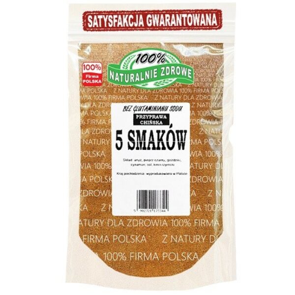 Przyprawa chińska 5 smakówPrzyprawa 5 smaków to mieszanka przyprawowa przede wszystkim używana w wielu daniach kuchni orientalnych. I o ile faktycznie jest często używana we wschodnich daniach, to najbardziej kojarzy się z potrawami chińskimi.Jak sama nazwa sugeruje, przyprawa 5 smaków składa z pięciu składników, które mają reprezentować pięć podstawowych smaków jakie znam, czyli słodki, słony, kwaśny, gorzki i umami, który czasem można określić jako mięsny i dający efekt tłustości w ustach. Taka kompozycja teoretycznie powinna sprawić, że dania smakować będą większości osób. Dużo oczywiście zależy też od użytych przypraw. Często w mieszance znajdują się anyż, goździki, cynamon, pieprz syczuański lub czarny i mielone nasiona kopru. Nie jest to jednak stały skład i w zależności od regionu czy producenta mogą występować drobne różnice, chociaż pierwsze skrzypce zawsze gra tutaj anyż.Przyprawa 5 smaków - do czego?Anyż jest przyprawą bardzo charakterystyczną dla kuchni azjatyckich, szczególnie daleko wschodnich. Połączenie słodkich i pikantnych nut sprawia, że jest to przyprawa dobrze komponująca się szczególnie z tłustymi mięsami jak wieprzowina czy kaczka, które często pojawiają się w potrawach chińskich. Mieszanka dobrze współgra również z owocami morza i nadaje się przez to także do potraw wietnamskich czy tajskich, gdzie udział np. krewetek jest większy.Oczywiście nic nie stoi na przeszkodzie, by przyprawy 5 smaków użyć do dań rodzimej kuchni. Bez problemu może być dodana do mięs różnego rodzaju, potraw warzywnych, sosów, zup i farszów. Dzięki temu nadamy znanym daniom nowego, orientalnego posmaku.Przyprawa chińska 5 smaków - właściwościMieszanka 5 smaków ma na celu odpowiednie doprawienie potraw, ale użyte zioła i przyprawy niosą ze sobą również działanie prozdrowotne. Nadający smaku i wybijający się z reszty anyż pomaga nie tylko w czasie infekcji jako środek na kaszel, ale wspomaga też laktację u kobiet karmiących podobnie, jak słód w syropie. Do tego aromatyczne goździki, które często kojarzone są z grzańcami, działają antybakteryjnie i odkażająco. Pieprz czarny, będący najostrzejszą odmianą, podkręca metabolizm, wspiera procesy trawienne, a nawet wykazuje właściwości przeciwnowotworowe. Cynamon działający rozgrzewająco i przeciwgrzybiczo. I w końcu kmin rzymski, czyli inaczej kumin - poprawiający wydzielanie enzymów i przynoszący ulgę osobom cierpiącym na IBS.Przyprawa chińska - gdzie kupić?Jak widać, przyprawa chińska 5 smaków to nie tylko doskonała propozycja dla fanów intensywnych doznań na podniebieniu, ale również dla osób chcących w szerokim aspekcie wspierać swój organizm: wzmacniać odporność i poprawiać trawienie. Można ją kupić zarówno w sklepach stacjonarnych, jak i w internetowych. Przypominamy jednak o uważnym czytaniu etykiet i wybieraniu czystych i krótkich składów. Mieszanka dostępna w Naturalnie Zdrowe nie posiada w sobie glutaminianu sodu ani innych dodatków chemicznych. Jest produktem bez GMO.Skład: anyż, pieprz czarny, goździki, cynamon, sól, kmin rzymskiKraj pochodzenia: wyprodukowano w PolsceW zakładzie wykorzystywane są surowce zawierające: gluten, sezam, różne orzechy, gorczycę, seler, składniki mleka i jaj, soja. Data przydatności i numer partii towaru znajdują się na opakowaniu. Przechowywać szczelnie zamknięte w suchym i chłodnym miejscu. Opakowanie może różnić się wyglądem w zależności od partii towaru.Producent: Naturalnie Zdrowe Barbara Bućko