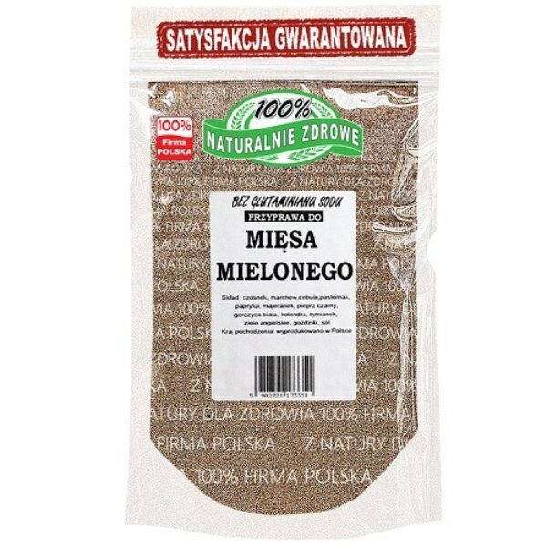 Przyprawa do mięsa mielonego Ciężko wyobrazić sobie kuchnię polską bez bigosu, kotletów schabowych czy pierogów. Do tego zacnego grona zaliczyć można również kotlety mielone, które bardzo często goszczą na naszych stołach. Oczywiście różnego rodzaju dania z mięsa mielonego to nie tylko domena rodzimych przepisów. Potrawy w każdym kształcie i wielkości są obecne w wielu miejscach na świecie: od chorwackich cevapcici, przez skandynawskie kottbullar aż po indyjskie kima. Przyprawa do mięsa mielonego - skład Nasza mieszanka to idealna kompozycja ziół i przypraw, która zagwarantuje niepowtarzalny smak nawet tak prostych dań, jak kotlety. Nie trzeba zresztą ograniczać się tylko do niego, bo skład będzie dobrze współgrał z wieloma innymi daniami. Przyprawą można też wzmacniać smak sosów, makaronów czy ziemniaków. Świetnie się nada również jako dodatek do panierek. Co zatem zawiera w sobie przyprawa do mięsa mielone? Jest to bukiet popularnych i często używanych przypraw typowych dla polskiej kuchni. Każde opakowanie to zestaw suszonych warzyw: czosnek, marchew, cebula, pasternak i seler. Do tego podstawowe przyprawy, czyli papryka, majeranek, pieprz czarny, gorczyca biała, kolendra, tymianek, ziele angielskie, goździki i sól. Przyprawa do mięsa mielonego bez zbędnych dodatków Warto również podkreślić, że oferowana przez nas mieszanka przyprawowa produkowana jest z surowców wolnych od GMO. W składzie nie znajdują się również zbędne polepszacze smaku jak glutaminian sodu. Dzięki temu zyskujemy gwarancję zarówno pysznego smaku przygotowywanych potraw, ale także pełnej naturalności. Jak używać przyprawy do mięsa mielonego? Nasza mieszanka jest banalnie prosta w użyciu. Wystarczy wymieszać ją ze swoim ulubionym gatunkiem mięsa mielonego i dodać niezbędne dodatki jak bułka tarta, posiekana cebulka, jajka i czosnek. Uzyskaną masę dzielimy na odpowiadające nam porcję i smażymy. Jeśli finalnie chcemy otrzymać pulpety, to wystarczy to robić tylko przez chwilę, a jeśli na stole ma pojawić się kotlet mielony z prawdziwego zdarzenia, to czekamy aż całość nabierze ładnego, brązowego koloru skórki. Przyprawa do mięsa mielonego jest do kupienia w sklepach stacjonarnych, ale te najczęściej dostępne są wzbogacane niepotrzebnymi polepszaczami smaku. Czytaj uważnie etykiety i wybieraj mądrze produkty w sprawdzonych sklepach jak Naturalnie Zdrowe. Skład: warzywa suszone (czosnek, marchew, cebula, pasternak, seler), przyprawy (papryka, majeranek, pieprz czarny, gorczyca biała, kolendra, tymianek, ziele angielskie, goździki), sólKraj pochodzenia: wyprodukowano w PolsceW zakładzie wykorzystywane są surowce zawierające: gluten, sezam, różne orzechy, gorczycę, seler, składniki mleka i jaj, soja. Data przydatności i numer partii towaru znajdują się na opakowaniu. Przechowywać szczelnie zamknięte w suchym i chłodnym miejscu. Opakowanie może różnić się wyglądem w zależności od partii towaru.Producent: Naturalnie Zdrowe Barbara Bućko