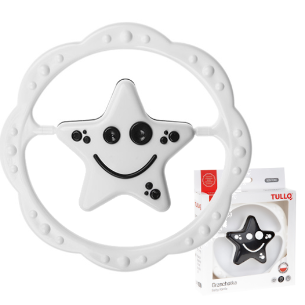 Od narodzin... Piękna czarno-biała grzechotka przeznaczona dla najmłodszych dzieci. Takie zestawienie kolorystyczne idealnie stymuluje zmysł wzroku u niemowlaka, który nie rozróżnia jeszcze barw. Grzechotka posiada lekką konstrukcję oraz odpowiedni rozmiar dla małej rączki :) Bezpieczna: grzechotka wykonana jest w UE z najwyższej jakości atestowanych surowców nie zawierają ftalanów, BPA, metali ciężkich Główne zalety: czarno-biała kolorystyka ćwiczy wzrok niemowlaka delikatne dźwięki stymulują zmysł słuchu różne struktury powierzchni rozwijają zmysł dotyku lekka konstrukcja oraz odpowiedni rozmiar dla małej rączki zachęcają do chwytania Wymiary produktu: wysokość 12 cm szerokość 12 cm Wymiary opakowania: szerokość 13 cm wysokość 15,5 cm głębokość 3,5 cm Polskie zabawki od 1959 roku Tullo to marka stworzona przez rodzinną firmę, w której tajniki wytwarzania przepięknych i przynoszących wiele radości zabawek przekazane zostały z ojca na syna. Od prawie 60 lat misją Tullo jest wspomaganie dzieci w rozwoju i dostarczanie im okazji do wspaniałej zabawy.