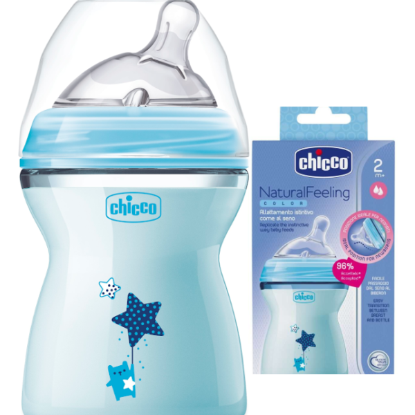 Idealna od samego początku Butelka Chicco to niezbędnik każdej wyprawki. Butelki z serii NaturalFeeling sprawdzą się w przypadku karmienia łączonego, gdy mama będzie nieobecna w porze karmienia, a jej pokarm poda dziecku tata lub babcia. Chicco NaturalFeeling czyli wspieranie karmienia naprzemiennego Smoczki w butelkach Chicco NaturalFeeling podążają za naturalnym i zmieniającym się sposobem ssania dziecka dlatego wspierają karmienie naprzemienne. Smoczki Chicco NaturalFeeling naśladują naturalny sposób ssania dziecka, który zmienia się w kolejnych miesiącach życia. Smoczki Chicco NaturalFeeling podązają za tymi zmianami, i tak: smoczki 0m+ i 2m+ są zakrzywione, ich podstawa jest szeroka, ponieważ na początku dziecko przystawia się do piersi szeroko i podczas ssania pracuje językiem i mięśniami policzków, smoczek 6m+ jest prosty i wydłużony, podstawa jest węższa, ponieważ dziecko przystawia się do piersi już bardziej wąsko i pracuje już głównie językiem. Antykolkowe i ergonomiczne Butelki Chicco NaturalFeeling mają działanie antykolkowe. Butelki posiadają 2 zawory antykolkowe, które zapobiegają połykaniu powietrza, a w efekcie przeciwdziałają kolkom. Butelki Chicco NaturalFeeling są wygodne i funkcjonalne. Ich ergonomiczny kształt zapewnia pewny i wygodny chwyt a szeroki gwint umożliwia łatwe napełnianie i czyszczenie butelki. Nie zawierają BPA. "Mum effect" Smoczki wyprodukowane są z miękkiego silikonu z aksamitną powłoką „mum effect”, która zapewnia jeszcze bardziej naturalne odczucia w trakcie ssania. Dzięki temu karmienie przebiega w sposób najbardziej zbliżony do naturalnego, a dziecko nie ma problemu z powrotem do karmienia piersią. Smoczek - idealny dla noworodków Ukośny smoczek ze średnim przepływem jest stworzony dla nowodorków. Chicco czyli wspieranie rodziców od 1958 roku Firma Chicco została założona w 1958 r. przez Pietra Catelli, który chciał uczcić narodziny swojego pierwszego syna Enrico, pieszczotliwie znanego jako „Chicco”. Stworzył markę specjalizującą się w produktach do pielęgnacji, która skierowana była dla dzieci od urodzenia do ukończenia 36 miesięcy. Tak narodziła się marka Chicco czyli lider na rynku światowym w produktach dla dzieci.