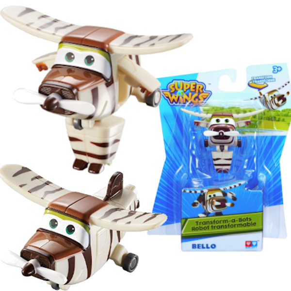 SUPER WINGS śMIGU ROBOT SAMOLOT 2w1 TRANSFORMUJĄCY Super Wings figurka ŚMIGU (ang. BELLO) jest to samolocik koloru beżowo-brązowego. Samolocik ma oryginalny wzór zebry, goolge lotnicze, śmigło na czubku nosa oraz podwójne skrzydła Posiada genialną umiejętność! Potrafi zmienić się z samolotu w robota! Masz dwie możliwości - szybujesz po niebieskich przestworzach lub zostajesz na ziemi. Którą wybierasz?!. Potrafi zmienić się z samolotu w robota! Masz dwie możliwości - szybujesz po niebieskich przestworzach lub zostajesz na ziemi. Którą wybierasz?! Bajkowy bohater jest teraz dostępny w formie zabawki – transformującej figurki 2w1. Dzieci mogą bawić się na dwa sposoby – samolotem lub robotem, odgrywając tym samym zapamiętane sceny serialowe. Całość zapakowana w pudełko idealne na prezent dla fana serialu. Zabawka powstała na podstawie animowanego serialu dla dzieci Super Wings. Serial ten opowiada o przygodach sześciu samolotów - Jetta, Dizzy, Donnie, Jeromea, Miry i Paula. Maluszek poprzez zabawę w odgrywanie ról rozwija swoją wyobraźnię, sprawność manualną oraz ćwiczy koncentrację. CECHY PRODUKTU: Zabawka z bajki Super Wings Wymiary figurki: ok. 6,5cm x 4,5cm x 4cm. Wymiary opakowania: 15cm x 12cm x 6cm Wiek dziecka: 3+ Certyfikat bezpieczeństwa CE