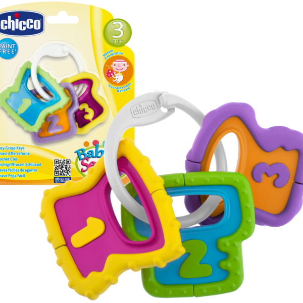 Zachęci do zabawy Grzechotka Klucze to lekka i łatwa do trzymania grzechotka, idealna dla dzieci w pierwszych miesiącach życia. Grzechotka składa się z 3 zawieszek w kształcie klucza z wyciśniętymi cyframi. Żywe, kontrastowe kolory przyciągają uwagę dziecka. Zabawka stymuluje umiejętności manualne dziecka. Informacje dodatkowe Ze względu na bezpieczeństwo dziecka zabawka pozbawiona jest elementów malowanych Chłodzić tylko w lodówce. Nie wkładaj do zamrażarki. Przed użyciem przeczytaj uważnie etykiety, ostrzeżenia i instrukcje wskazane na opakowaniu produktu Chicco czyli wspieranie rodziców od 1958 roku Firma Chicco została założona w 1958 r. przez Pietra Catelli, który chciał uczcić narodziny swojego pierwszego syna Enrico, pieszczotliwie znanego jako „Chicco”. Stworzył markę specjalizującą się w produktach do pielęgnacji, która skierowana była dla dzieci od urodzenia do ukończenia 36 miesięcy. Tak narodziła się marka Chicco czyli lider na rynku światowym w produktach dla dzieci.