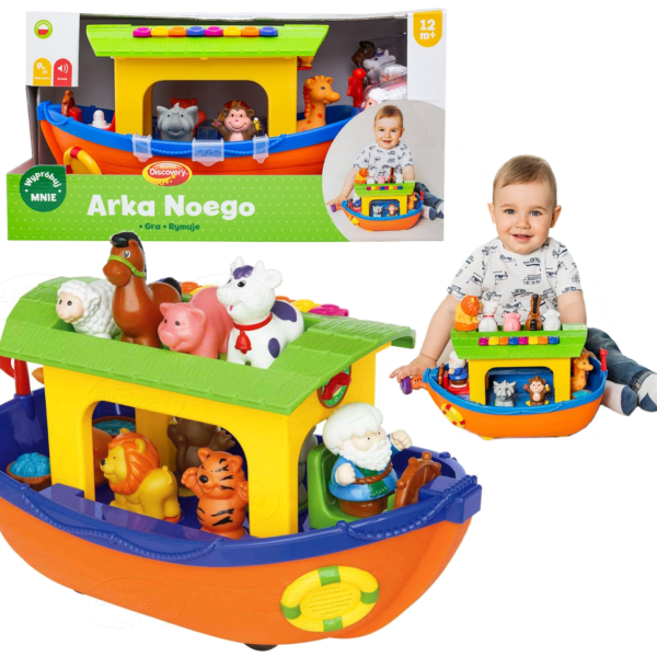 Nauka poprzez zabawę Arka Noego zawiera 9 zwierzątek, które nagrodzą dziecko realistycznymi odgłosami lub zabawną rymowanką za każdym razem, gdy malec odgadnie prawidłowy kształt i umieści zwierzaka na właściwym miejscu. Pokocha ją każde dziecko Ster arki po przekręceniu wydaje realistyczne dźwięki. Zabawka posiada kolorowe mini pianinko, na którym można zagrać własną kompozycję. Istnieje możliwość doczepienia sznureczka do arki za pomocą którego może być prowadzona przez maluszka. Arka podczas jazdy imituje ruchy „płynącej na falach łodzi”. Zabawka przeznaczona od 12 miesiąca. Producent Firma DUMEL od 1999 roku jest importerem zabawek i akcesoriów dla dzieci. Powstała z myślą o dzieciach, które są największym skarbem świata. Celem firmy jest, aby podczas zabawy zabawkami dziecko było zadowolone i uśmiechnięte, aby nasze zabawki angażowały do kreatywnej zabawy i rozbudzały w dzieciach potrzebę tworzenia. Każda zabawka firmy Dumel wykonana jest z najwyższej jakości surowców, odpowiada europejskim normom bezpieczeństwa oraz posiada certyfikat CE.