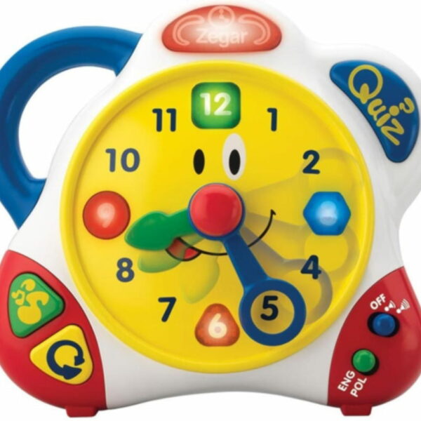 DUMEL DISCOVERY INTERAKTYWNY DWUJĘZYCZNY ZEGAR TIK TAK KOD PRODUCENTA: DD 38987 WIEK: 2+ Naucz się odczytywać godziny oraz rozpoznawać kształty i liczby Idealne połączenie nauki i zabawy Wesoły, dwujęzyczny (angielski/polski) zegar, który poprzez zabawę pomoże Maluszkowi w nauce cyfr, godzin i rozpoznawaniu kształtów. Kiedy dziecko zacznie przesuwać wskazówki, usłyszy ustawioną przez siebie godzinę. Po przełączeniu na „Quiz”, Maluszek będzie miał za zadanie wskazać konkretną godzinę. Zegar wyposażony jest także w wesołe melodie i świecące przyciski, które zachęcą dziecko do zabawy. Wygodny do przenoszenia uchwyt pozwoli zabrać ze sobą Zegar w dowolne miejsce. Producent Firma DUMEL od 1999 roku jest importerem zabawek i akcesoriów dla dzieci. Powstała z myślą o dzieciach, które są największym skarbem świata. Celem firmy jest, aby podczas zabawy zabawkami dziecko było zadowolone i uśmiechnięte, aby nasze zabawki angażowały do kreatywnej zabawy i rozbudzały w dzieciach potrzebę tworzenia. Każda zabawka firmy Dumel wykonana jest z najwyższej jakości surowców, odpowiada europejskim normom bezpieczeństwa oraz posiada certyfikat CE. Zabawka przeznaczona dla dzieci od 2 lat.