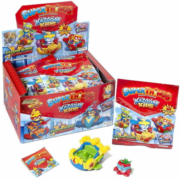 SERIA SUPERTHINGS JEST KONTYNUACJĄ KULTOWEJ SERII ZABAWEK SUPER ZINGS. JEST TO 8 SERIA "KAZOOM KIDS", ZBIERZ PONAD 80 NOWYCH FIGUREK. W serii SuperThings Kazoom Kids zarówno SuperThings, jak i Kazoom Kids poruszają się w swoich supernowoczesnych pojazdach z efektem „naciągania”: naciągnij pojazd a on wystrzeli do przodu, dzięki napendowi! Turbo Crust to smaczny, ale potężny slider, który wykorzystuje energię z pieców do pizzy, aby napędzać się do przodu z maksymalną prędkością; Nitro Flavour wykorzystuje swoją lodową moc, aby być najbardziej poślizgowym Kazoom Slider; Soda Sonic rzuca strumieniami zupy, aby poruszać się po ulicach Kaboom City; Trash Clash to potężny pojazd pancerny wykonany z metalu i śmieci; Party Hard to kołyszący samochód pełen muzyki i kolorów; Candy Flash działa z energią z cukru i jest idealny na słodką podróż do zwycięstwa. Każdy z sliderów dostępny jest w dwóch kolorach. Przybyły SuperThings Kazoom Kids! Do zebrania jest ponad 80 nowych postaci. Znajdź srebrne i złote figurki oraz niezwykle rzadki Neonblast, iskrę energii powstałą w wyniku nieudanego eksperymentu profesora K, biegnącą swobodnie przez Kaboom City, siejąc spustoszenie i ładując każdy obiekt, którego dotknie, energią Kazoom. Kiedy zwykli chłopcy i dziewczęta są narażeni na te przedmioty zamieniają się w Kazoom Kids i mają niesamowite moce! W mieście jest 6 nowych kapitanów: i są to Kazoom Kids! Zestaw zawiera: 12x Pojazd Slider Kazoom 12x Figurka Super Things PRODUKT FABRYCZNIE ZAPAKOWANY(ORYGINALNIE WYSYŁANY W KARTONIE). SASZETKI WYSTEPUJA LOSOWO. Cechy: Zbieraj Turbo Crust, Nitro Flavour, Soda Sonic, Trash Clash, Party Hard i Candy Flash! Do zebrania jest 12 sliderów Kazoom i niezwykle rzadki, złoty slider Kazoom! Naciągnij je do tyłu, a wystrzelą do przodu do bitwy! Ponad 80 nowych SuperThings do zebrania! Zbuduj własny superteam. producent - MagicBox Toys figurki z najnowszej serii 8 SuperThings Kazoom Kids wysokość figurek to około 3 cm Produkt jest nowy, oryginalny i pochodzi z oficjalnej dystrybucji.