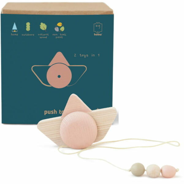 BABAI STATEK NA KÓŁKACH DO CIĄGNIECIA STATEK NA KÓLKACH Drewniana zabawka 2w1, którą dziecko może popychać jak małe autko lub ciągnąć za sobą na sznureczku. Minimalistyczna forma; brak ostrych rogów, krawędzi itp.; odczepiany sznurek z koralikami ułatwiającymi dziecku jego chwycenie. Zabawka "open-ended" - nie ma jednoznacznego, narzuconego z góry zastosowania; wiele możliwości zabawy; wspiera rozwój dziecka na różnych płaszczyznach w tym małą motorykę, koordynację, zachęca do chodzenia; Wysokiej jakości surowce i wykończenie; produkt przyjazny środowisku; doskonały pomysł na ponadczasowy prezent dla dziecka. Parametry techniczne: wiek: 1+ (zabawka bez sznurka); 3+ w opakowaniu: 1 statek ze sznurkiem; materiał: jesion, nietoksyczna farba wodna, bawełniany sznurek; wymiary: 125 x 55 x 85 mm; waga: 0,16 kg; opakowanie: kartonowe pudełko, papierowa saszetka. Producent Babai to wyjątkowa ukraińska pracownia projektowa z Kijowa tworząca ekologiczne i rozwijające kreatywność zabawki i akcesoria do domu. Drewniane produkty Babai wykonane są z certyfikowanego FSC drewna pochodzącego z okolic najbardziej zielonego miasta w Europie jakim jest Kijów.