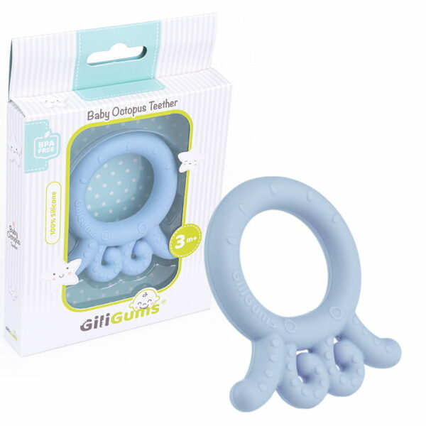 GiliGums gryzak silikonowy Wzór: ośmiornica Wiek: +3m IDEALNY GRYZAK PODCZAS ZĄBKOWANIA Silikonowy gryzak w kształcie ośmiornicy łączy w sobie walory estetyczne i praktyczne! Stylowy wygląd oraz piękny, błękitny kolor, czynią z niego modny dodatek dla każdego malucha. Ośmiornicę zdobią drobne wypustki, które, podczas gryzienia, delikatnie masują obolałe dziąsła dziecka, przynosząc mu ulgę. Produkt przeznaczony jest dla dzieci od 3 miesiąca życia. Cechy produktu: – zróżnicowane faktury – wypustki do masowania dziąseł – kształt dostosowany do małych rączek – wiek: 3m+