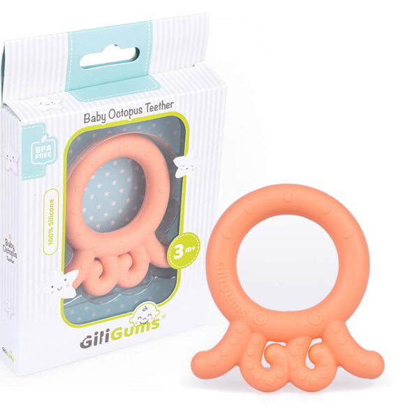 GiliGums gryzak silikonowy Wzór: ośmiornica Wiek: +3m IDEALNY GRYZAK PODCZAS ZĄBKOWANIA Silikonowy gryzak w kształcie ośmiornicy łączy w sobie walory estetyczne i praktyczne! Stylowy wygląd oraz piękny, błękitny kolor, czynią z niego modny dodatek dla każdego malucha. Ośmiornicę zdobią drobne wypustki, które, podczas gryzienia, delikatnie masują obolałe dziąsła dziecka, przynosząc mu ulgę. Produkt przeznaczony jest dla dzieci od 3 miesiąca życia. Cechy produktu: – zróżnicowane faktury – wypustki do masowania dziąseł – kształt dostosowany do małych rączek – wiek: 3m+