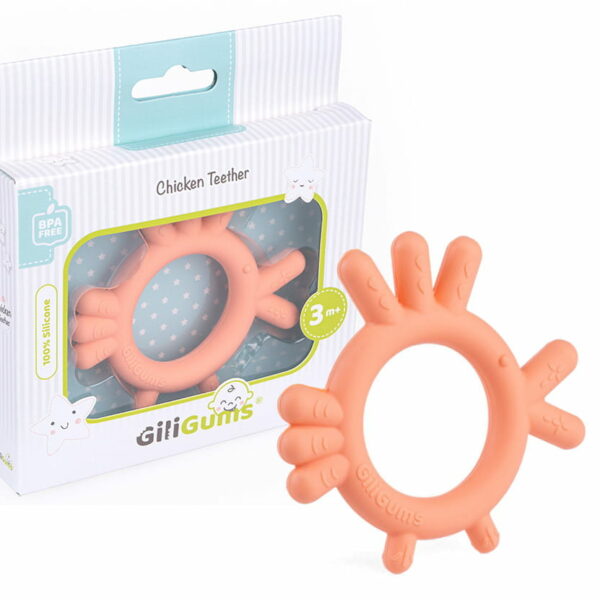 GiliGums gryzak silikonowy Wzór: kurczaczek Wiek: +3m IDEALNY GRYZAK PODCZAS ZĄBKOWANIA Uroczy, silikonowy kurczak przyniesie ulgę w ząbkowaniu i zabawi malucha! Zróżnicowane faktury gryzaka sprawiają, że podczas gryzienia, delikatnie masuje on obolałe dziąsła dziecka. Kształt gryzaka jest idealnie dostosowany do małych rączek, a bezpieczne, silikonowe tworzywo, z którego został on wykonany, pozwoli utrzymać gryzak w czystości. Produkt przeznaczony jest dla dzieci od 3 miesiąca życia. Cechy produktu: – zróżnicowane faktury – wypustki do masowania dziąseł – kształt dostosowany do małych rączek – wiek: 3m+
