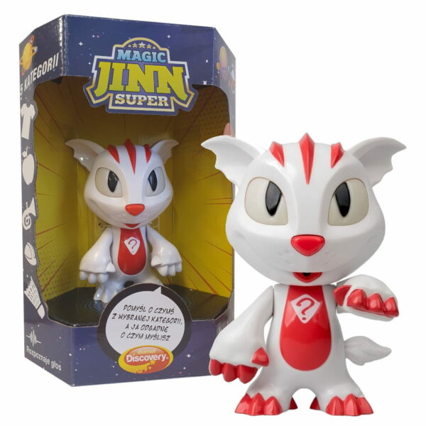 Magic Jinn, który zgaduje aż w 5 kategoriach! Zmierz się z nim i poznaj jego super moc! Super Magic Jinn to nowa wersja znanej już dobrze zabawki, która potrafi czytać w myślach. Zabawne zwierzątko zgaduje w pięciu kategoriach: ubrania, owoce i warzywa, instrumenty muzyczne, zawody oraz sporty. Pomyśl o czymś z wybranej kategorii, odpowiadaj szczerze na pytania zadawane przez Jinna używając słów: tak, nie, nie wiem, to zależy, a on odgadnie o czym myślisz. Baw się dobrze stawiając mu kolejne wyzwania! Jeżeli będziesz sprytniejszy od niego i znasz hasło z danej kategorii, którego nie zna Jinn – wygrasz! Zabawka przeznaczona dla dzieci od 5 roku życia.