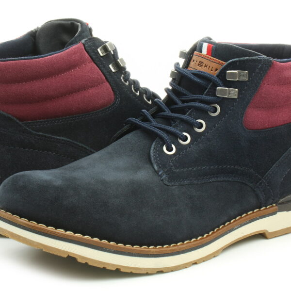 Najnowsza propozycja dla mężczyzn od marki Tommy Hilfiger na chłodne dni. Cholewka do kostki została wykonana z naturalnego zamszu w kolorze granatowym. Do ocieplenia wnętrza zastosowano materiał tekstylny. Zastosowanie sznurowania umożliwia pełne dopasowanie obuwia do stopy. Miękki, wiśniowy kołnierz gwarantuje komfort użytkowania oraz zapobiega ewentualnym otarciom. Kremowa podeszwa z bieżnikiem zapewnia doskonałą przyczepność na śliskich nawierzniach. Niezastąpione w połączeniu z jeansami. Polecamy!