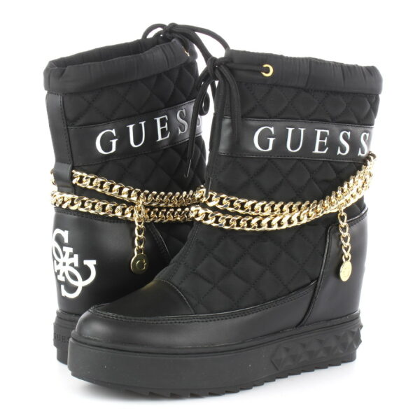 Wysokie, damskie obuwie zimowe Guess. Stylizowane na śniegowce, wykonane z materiału tekstylnego zimowe buty to propozycja dla pań ceniących sobie styl i wygodę w połączeniu z funkcjonalnością. Podwyższona podeszwa wykonana z wysokogatunkowego materiału. W tylnej części cholewki umieszczony jest biały, dobrze widoczny logotyp Guess. Dodatkowy łańcuszek w kolorze złotym z ozdobną zawieszką dodaje szyku klasycznemu wyglądowi, a przy tym pozwoli dopasować obuwie do większości damskich stylizacji ze względu na stonowany dobór kolorów.