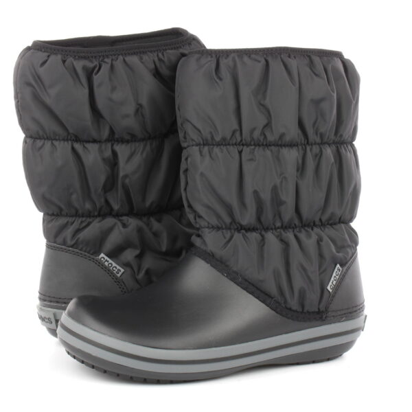 Damskie śniegowce Crocs. Przy produkcji dolnej części cholewki i podeszwy zastosowano doskonale znany klientom z topowego modelu tej marki tworzywo Croslite. Tworzywo to zrewolucjonizowało rynek obuwniczy na świecie, wykonane z żywicy, możliwe do recyklingu, a przy tym wygodne, lekkie i ergonomiczne. Warto dodać, że materiał ten nie pochłania zapachów. Górna część cholewki wykonana z nylonu ocieplona materiałem z dodatkiem polaru i z dodatkowym ściągaczem gwarantuje ciepło i komfort użytkowania. Gumowa podeszwa gwarantuje dobrą przyczepność do podłoża.