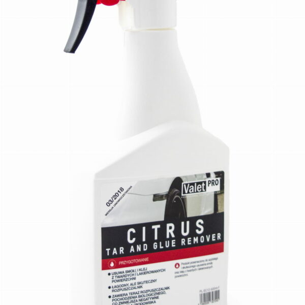 ValetPRO Citrus Tar And Glue Remover robi dokładnie to, co opisuje nazwa; usuwa pozostałości smoły i kleju. Produkt został zaprojektowany do usuwania lepkich substancji z twardych i pomalowanych powierzchni. Jest to rafinowany rozpuszczalnik alifatyczny wzmocniony naturalnymi olejkami cytrusowymi, zaprojektowany tak, aby był łagodny dla powierzchni, ale bardzo skuteczny w działaniu. Usuwanie smoły i kleju z twardych (blacha, plastik, szkło) i powierzchni lakierowanych Skuteczny w działaniu i łagodny dla powierzchni Zawiera dodatek z naturalnych olejów cytrusowych Wskazówki: Spryskaj zabrudzone obszary, pracując na jednym elemencie na raz. Zawsze używaj na suchej i chłodnej powierzchni. Odczekaj moment aż zauważysz rozpuszczające się zabrudzenia. Nanieś środek na uniwersalną ściereczkę z mikrofibry. Przetrzyj dany obszar. Powtarzaj czynności aż do usunięcia zanieczyszczenia. Bardzo dokładnie opłukaj czyszczoną powierzchnię wodą pod wysokim ciśnieniem. Uwaga: Jeżeli pojazd został przemalowany lub miał naprawę typu „SMART”, przeprowadzić test w niewidocznym miejscu.