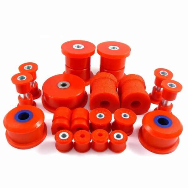Czym są tuleje poliuretanowe? PU składa się z izocyjanianu i poliolu, które są wytwarzane z ropy naftowej. Połączenie tych dwóch substancji oraz dodanie kilku pomocniczych jak stabilizatory, katalizatory, środki spieniające wpływa na powstanie poliuretanu. Możemy regulować sztywność materiału za pomocą tych proporcji składników. Nasze zawieszenie narażone jest na różnego rodzaju obciążenia. Elementy z gumy z biegiem czasu kruszeją i ulegają uszkodzeniu. Zestaw zawieszeniaProsimy o wybranie tulei wahacza przedniego oraz średnicy stabilizatora przedniego i tylnego. W skład kompletu wchodzą: - 2szt. Tuleja wahacza przedniego tylna centrycznalub- 2szt. Tuleja wahacza przedniego tylna acentryczna - 2szt. Tuleja stabilizatora przedniego- 2szt. Tuleja stabilizatora tylnego - 1szt. Poduszka tylnego dyferencjału - 2szt. Tuleja łącznika stabilizatora tylnego - 2szt. Tuleja łącznika stabilizatora tylnego- 2szt. Tuleja łącznika stabilizatora przedniego- 2szt. Tuleja belki tylnej- 4szt. Tuleja wahacza tylnego Pasuje do: - BMW E36 Compact 1994-2000- BMW Z3 1997-2002 Twardość: 80ShA lub 90ShA Kod produktu: 800901