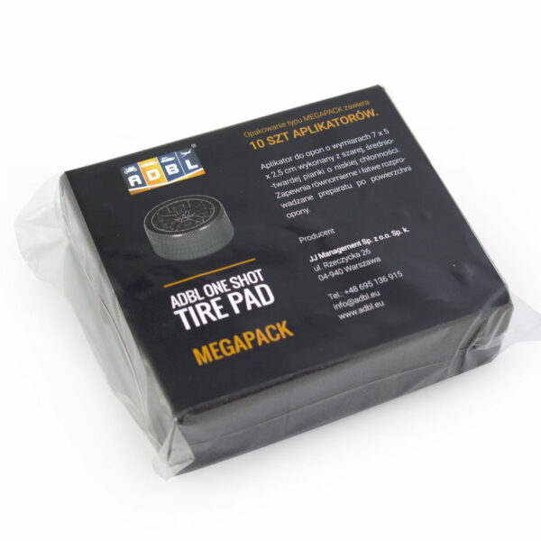 ADBL ONE SHOT TIRE PAD MEGAPACK Zestaw dziesięciu aplikatorów do opon wykonanych z szarej Aplikator do opon o wymiarach podanych powyżej, wykonany został ze specjalnej szarej, średnio-twardej pianki o niskiej chłonności, co powoduje, że dressing nie jest wchłaniany nadmiernie w produkt. Aplikator zapewnia równomierne i łatwe rozprowadzanie preparatu do zabezpieczania opon. Wymiary pojedynczego aplikatora: 7 cm x 5 cm x 2,5 cm