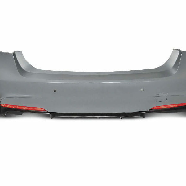 Kompletny tylny zderzak BMW seria 3 F30 11-18 Sedan M-PerformanceZderzak z otworami na czujniki parkowania PDC Element wykonany z polipropylenu gotowy do pomalowania. Komplet zawiera: Dyfuzor na podwójną końcówkę wydechu z lewej strony Wzmocnienie zderzaka Światła odblaskowe