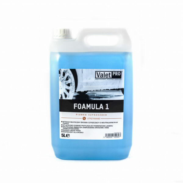 ValetPRO Foamula 1 5L ValetPRO Foamula 1 to profesjonalna, wyjątkowo wydajna piana aktywna o neutralnym pH, która dzięki swojemu silnemu skoncentrowaniu zapewnia długotrwałe utrzymywanie się na czyszczonej powierzchni a co za tym idzie lepszą penetrację i zmiękczenie brudu znajdującego się na lakierze. Prawdziwie wszechstronna może być wykorzystana również jako nośnik innych środków. Sama w sobie Foamula 1 dzięki neutralnemu pH idealnie nadaje się do stosowania na samochodach zabezpieczonych woskiem lub powłoką. Zastosowanie: Dodaj 300 ml piany do 700 ml wody i przelej do 1-litrowej pianownicy. Dostosuj dozowanie piany w przypadku pianownicy ciśnieniowej lub stężenie piany w przypadku pianownicy ręcznej aby dopasować poziom piany wymagany do wykonywanej pracy. Nanieś pianę aktywną na całą powierzchnię pojazdu, w tym koła, szyby i listwy. Pozostaw na pięć minut, a następnie dokładnie spłucz myjką ciśnieniową. Alternatywne rozcieńczenie: 1: 5 (mocno zabrudzone koła) do 1:20 (lekki brud) w zależności od wykonywanego zadania. W razie potrzeby wstrząśnij, a następnie dokładnie spłucz. Uwaga: Nie pozwól, aby produkt wysechł na lakierze. Jeśli to możliwe, aplikuj pianę tylko na samochód znajdujący się w cieniu , nienarażony na bezpośrednie oddziaływanie słońca. Pojemność: 5000 ml