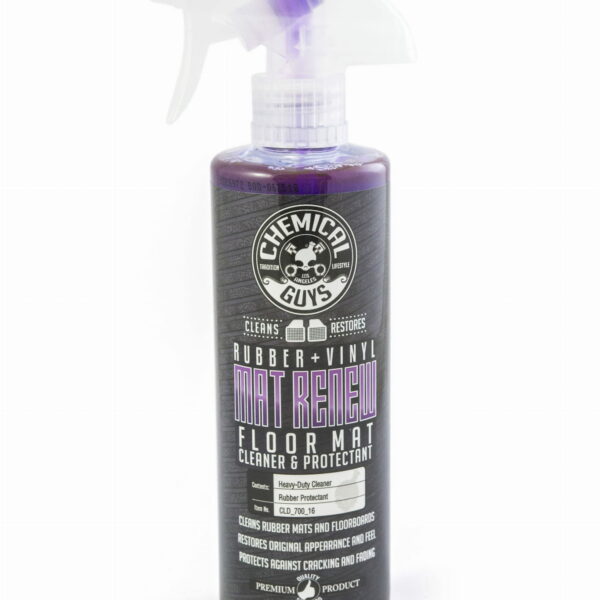 Chemical Guys Mat Renew Rubber + Vinyl Floor Mat Cleaner And Protectant - Środek do czyszczenia gumowych elementów oraz dywaników Mat Renew Rubber + Vinyl Floor Mat Cleaner And Protectant to uniwersalny środek czyszczący elementy gumowe oraz dywaniki samochodowe. Skutecznie penetruje brud, błoto i jego pozostałości, nadając matowe wykończenie zabezpieczające element. Nie powoduje połysku i nie tworzy śliskiej powierzchni na dywanikach. Użyj tego aby: Wyczyścić maty gumowe i dywaniki samochodowe Zachować oryginalny wygląd i matowe wykończenie Chronić przed pękaniem i blaknięciem Przywrócić wyblakłą gumowy element do oryginalnego stanu Pojemność: 473ml