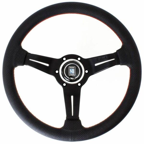 Kierownica Nardi Deep Corn Leather Steering Wheel 330mm Nardi to marka opracowująca najwyższej jakości kierownice od 1932 roku. Zasłynęła jako producent podstawowych kierownic, które montowane były do samochodów wyczynowych oraz akcesoriów wewnętrznych. Do dziś elementy tego producenta uważane są za bardzo wartościowe na scenie tuningu. Oryginalny produkt sprowadzany na specjalne zamówienie klienta. Jeśli jesteś nim zainteresowany skontaktuj się z nami przez formularz kontaktowy, lub na adres mailowy info@oemtuning.pl Średnica kierownicy: 330mmOdsadzenie: 53mmWykończenie: skóra perforowana, czarna, z czerwonym przeszyciem, białymi ramionami oraz klaksonem z logo Nardi Torino.