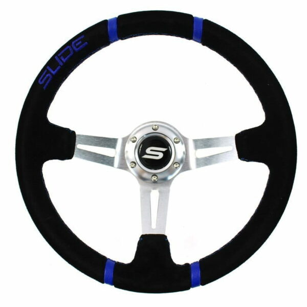 Slide Leather Steering Wheel Silver-Blue 350mm - Skórzana kierownica z odsadzeniem Sportowa kierownica skórzana srebrna firmy Slide z akcentami w kolorze niebieskim. Wykonana z wysokiej jakości materiałów idealnie nadaje się do użytku w pojazdach przeznaczonych do driftu, rajdów czy innych sportów motorowych. Delikatny materiał świetnie współpracuje z dłońmi kierowcy pochłaniając wilgoć pojawiającą się na dłoniach. Lekko pofałdowana powierzchnia, w dotyku satynowa oraz szczotkowany metal dodają kierownicy rasowego wyglądu. Parametry: Średnica kierownicy: 350mm Głębokość odsadzenia: 90mm W zestawie wszystkie potrzebne elementy montażowe: śruby, przewody i klucz imbusowy. Kierownica nie posiada homologacji drogowej. Przeznaczona tylko do użytku w sportach motorowych lub na wystawach.