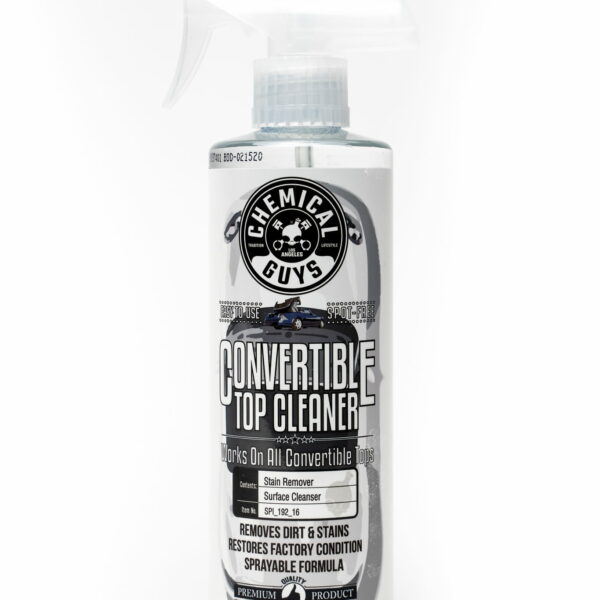Chemical Guys Convertible Top Cleaner 473ml - Środek do czyszczenia dachów cabrio Dlaczego ten produkt? Czyści dachy cabrio oraz pokrywy przestrzeni ładunkowej w samochodach typu pick-up Bezpiecznie usuwa zabrudzenia Działa na miękkich powierzchniach winylowych, tkaninowych, płóciennych, tekstylnych i syntetycznych Łatwe użycie dzięki aplikacji w sprayu Przywraca fabryczny wygląd Działa na wszystkich kolorach