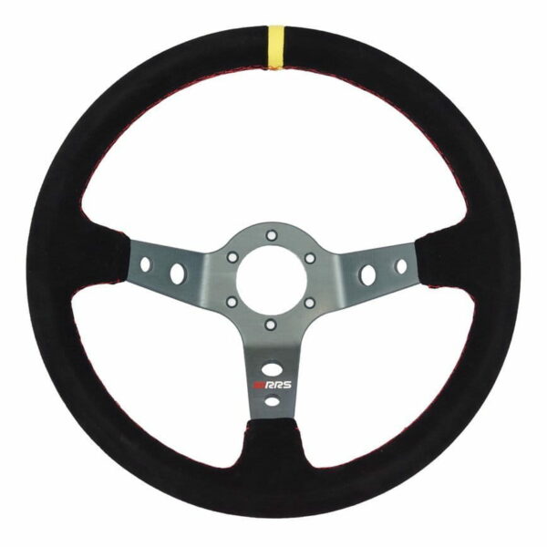 RRS Rally Suede Steering Wheel Titanium 350mm - Zamszowa kierownica z odsadzeniem Sportowa kierownica zamszowa firmy RRS z akcentami w kolorze czerwonym (nić) i żółtym (pasek w górnej części). Wykonana z wysokiej jakości materiałów idealnie nadaje się do użytku w pojazdach przeznaczonych do driftu, rajdów czy innych sportów motorowych. Parametry: Średnica kierownicy: 350mm Głębokość odsadzenia: 90mm Kolor ramion: Tytanowy W zestawie wszystkie potrzebne elementy montażowe: klakson, śruby, przewody. Kierownica nie posiada homologacji drogowej. Przeznaczona tylko do użytku w sportach motorowych lub na wystawach.