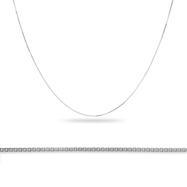 Długość obwodu łańcuszka: 42 cmRodzaj splotu: kostkaSzerokość splotu łańcuszka: 1 mmPróba srebra: 925ŁAŃCUSZEK 42 CM SPLOT KOSTKA - IDEALNY DO ZAWIESZEKSplot kostka jest najbardziej klasycznym i bardzo popularnym - zarówno wśród Pań, jak i Panów - wzorem, z kwadratowymi ogniwami połączonymi poprzecznie, pod katem 90 stopni. Ogniwa są najczęściej drobne, a łańcuszek pięknie odbija światło i dobrze układa się na szyi. Łańcuszki ze splotem kostka są wprost idealne do noszenia z zawieszkami.SREBRNY ŁAŃCUSZEK KOSTKA O DŁUGOŚCI 42 CMDelikatny (szerokość splotu 1 mm) srebrny łańcuszek 42 cm ze splotem kostka będzie świetnie prezentował się na kobiecej szyi. Poniżej prezentujemy przykładową kobiecą wizualizację łańcuszka o tej długości. Pamiętaj, że rzeczywiste ułożenie łańcuszka będzie zależało od wzrostu i budowy ciała osoby, dla której łańcuszek jest przeznaczonyPrzykładowa kobieca wizualizacja srebrnego łańcuszka o długości 42 cmDOBIERZ ŁAŃCUSZEK WG RODZAJU SPLOTU I DŁUGOŚCIAby maksymalnie