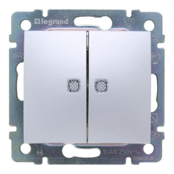 Łącznik podtynkowy świecznikowy podświetlany. Łącznik podwójny z podświetleniem wyposażony w 2 przyciski, przeznaczony do żyrandoli (podzielonych na 2 strefy). Posiada możliwość załączania dwóch różnych scen oświetlenia w pomieszczeniu.Dane techniczne:Napięcie znamionowe: 250V ACPrąd znamionowy: 10AStopień ochrony: IP20Zaciski przyłączeniowe samozaciskowe.Możliwość montażu w puszcze przy użyciu pazurków lub wkrętów.