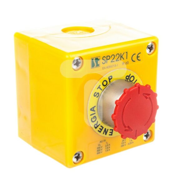 Kaseta z przyciskiem bezpieczeństwa przez obrót 1R IP65 żółta 1x dławnica M20 SP22K1\05-1