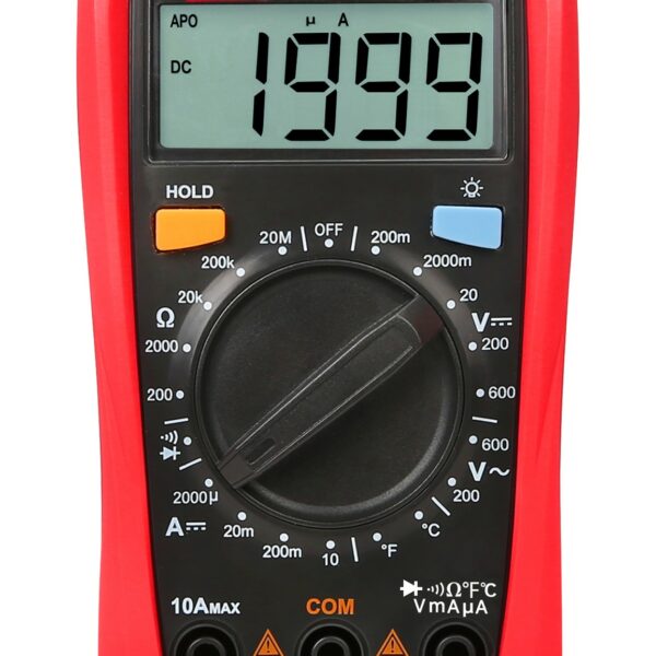 Dane techniczne:Napięcie DC: 200 mV / 2000 mV / 20 V / 200 V / 600 V ±(0,5%+2)Napięcie AC: 200 V / 600 V ±(1,2%+3)Natężenie prądu stałego DC: 2000 µA / 20 mA / 200 mA / 10 A ±(1%+2)Rezystancja: 200 Ohm / 2000 Ohm / 20 kOhm / 200 kOhm / 20 MOhm ±(0,8%+2)Temperatura: -40°C~1000°C (1%+4) / -40°F~1832°F (1,5%+5)Test diodSprawdzanie ciągłości obwoduDODATKOWE FUNKCJERęczna zmiana zakresów pomiarowychZamrożenie ostatniego wskazaniaWskaźnik niskiego poziomu bateriiMaksymalny odczyt: 2000Podświetlany ekran LCDCECHY OGÓLNEImpedancja wejściowa napięcia stałego: około 10 MOhmZasilanie: bateria 2x bateria 1,5 V (R03)Rozmiar wyświetlacza: 48 x 16 mmWymiary produktu: 134 x 77 x 47 mmWaga produktu: 206 gAkcesoria: Baterie, przewody pomiarowe, holster
