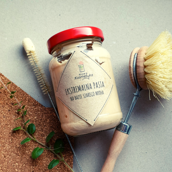 Ekstremalna pasta czyszcząca Lepiej pracować sprytnie niż ciężko, prawda? Naszym zdaniem ta mądrość pokoleń szczególnie mocno dotyczy sprzątania. Jeśli tak, jak my, lubisz, kiedy jest czysto, ale nie masz zamiaru trzeć, szorować i umartwiać się, to bardzo możliwe, że polubisz też tą intensywną pastę czyszczącą. A teraz najlepsza informacja: to środek o składzie opartym na naturalnym, szarym, potasowym mydle i olejkach eterycznych. I do tego ma ekstraziołowy zapach! Szare mydło , bo o nim mowa, czyści skutecznie , jest nieszkodliwe dla zdrowia i jest w całości biodegradowalne. Towarzyszy mu soda oczyszczona , o której dokonaniach można by opowiadać miesiącami (odtłuszcza, usuwa zastały, uporczywy brud, problematyczne osady, przypalone resztki i wiele innych strasznych rzeczy). Do tego trochę odtłuszczającego powierzchnie alkoholu , woda i gliceryna , która powstaje podczas zmydlania. Całości dopełnia moc olejki eterycznych , które chronią przed zepsuciem i nadają świeży zapach . Jedni kojarzą go z Amolem, inni z tygrysią maścią. My uważamy, że to po prostu miła odmiana od przemysłowej chemii domowej. Jak i kiedy używać pasty? Wszędzie tam, gdzie inne środki nie dały rady. Przypalona kuchenka, osad na płytkach lub osłonie prysznica? Tak, to te klimaty. Okolice miejsc, które możesz podsumować hasłem ,,dawno tego nie odsuwaliśmy"? Właśnie, to o nie chodzi. A do tego WC, okolice odpływów i sanitariaty w ogólności. Pastę należy nałożyć myjką/gąbką, odczekać kilka minut, a potem przetrzeć i dokładnie wypłukać wodą. I już. Składniki:Mydło potasowe słonecznikowe, Soda oczyszczona, Gliceryna, Woda, Alkohol, Olejki Eteryczne: z Mięty Pieprzowej i Cynamonowca, Limonen*, Linalool* *to substancje naturalnie zawarte w olejkach eterycznych, których nie dolewamy dodatkowo, ale chcemy informować alergików o ich obecności Słoiczek zawiera 175 g pasty.