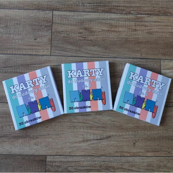 MóWiMy Karty do budowy zdańMóWiMy Karty do budowy zdań to kolejny pomysł na świetną zabawę z dzieckiem, wspierającą rozwój mowy. Zabawa z kartami rozwija zarówno mówienie, jak i rozumienie mowy w atrakcyjnej, pełnej śmiechu formie. MóWiMy Karty do budowy zdań:Składają się z trzech kompletów kart ze słowami, dzięki którym dziecko będzie budowało swoje pierwsze zdania.Każdy zestaw zawiera 30 słów na 15 dwustronnych kartach. W trzech częściach Kart do budowy zdań otrzymasz łącznie 90 słów, dobranych tak, by w prosty sposób, na zasadzie zabawy, tworzyć zdania.Każdy zestaw ma inny kolor karty, ułatwiając odpowiednie ułożenie słowa w zdaniu.Dodatkowo, karty mogą posłużyć do nauki pojedynczych słów.Wszystkie słowa zobrazowane są rzeczywistymi zdjęciami.W zestawie znajdziesz również instrukcję zawierającą wiele propozycji form zabawy z Kartami.Karty są wykonane z grubego kartonu i odpowiednio duże (15cm/15cm) do chwycenia przez małą rączkę.MóWiMy - pomoce i materiały do rozwoju mowy i terapii logopedycznejNazwa MóWiMy to tak naprawdę imiona trzech postaci Mówków:Mó - to długonoga piękność z bujną fryzurą. Maskotka, która zawsze i wszędzie chętnie potowarzyszy dziecku.Wi - to przemiły grubasek z jeżykiem na głowie, który, jako pacynka, będzie pomagał logopedzie w gabinecie lub rodzicowi podczas ćwiczeń w domu.My - natomiast to przytulny chłopak. Jego postać to miękka przytulna ściereczka, która pozwoli zrobić ze sobą wszystko.Realizacja całego programu metody musiała zacząć się od strony merytorycznej, czyli od Zeszytów. Projekt MóWiMy, zgodnie z metodą doboru głosek, obejmuje wiele pomocy i materiałów do rozwoju mowy i terapii logopedycznej, ale też do nauki czytania. Seria MóWiMy będzie dalej rozwijana. O AutorceKarina Mikulska-Hofman - logopedka, która od zawsze stara się pracować z dziećmi tak, żeby dopasować się do Ich możliwości i nastroju. Obserwując możliwości dzieci i dopasowując się do Nich, stworzyła swoje własne ścieżki terapeutyczne. Jedną z nich jest metoda doboru głosek, czyli program rozwoju mowy. Odpowiedni dobór wyrazów do kolejnych etapów składa się na wyjątkowość i skuteczność tego podejścia.Zobacz wideo i poznaj Zeszyty MóWiMy!