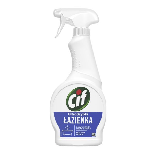 Cif Ultrafast Bathroom Spray Do Czyszczenia Łazienki 500ML Teraz Cif Ultrafast Łazienka w nowym opakowaniu i z jeszcze lepszą formulacją. To Twoja nowa broń w walce z nawet najbardziej uporczywymi zabrudzeniami jak osady z kamienia, twardej wody, kosmetyków i mydła. Składniki czyszczące kamień sprawiają że skutecznie usuwa kamień ze wszystkich powierzchni pozostawiając świeży zapach czystości. Skutecznie usuwa nawet do 100% kamienia.Czyści osad z mydła i ślady z twardej wody – także nagromadzone w długim czasie.Składniki czyszczące kamień pochodzenia w 100% naturalnego.Użycie biodegradowalnych substancji czyszczących i usuwajacych kamień.Gwarantuje 100% połysku bez smug.Formuła sprayu nie pozostawia smug i pozwala z łatwością uzyskać lśniącą czystość.Wersja: ŁazienkaSpray wykorzystuje biodegradowalne substancje czyszczące i zapewnia połysk bez smug czyszczonych powierzchni. Sposób użycia:Spryskać powierzchnię.W przypadku trudnych zabrudzeń pozostawić kilka minut.Wytrzeć mokrą ściereczką.UWAGA: Szata graficzna produktu może się różnić jednakże produkt pozostaje ten sam z tymi samymi właściwościami!