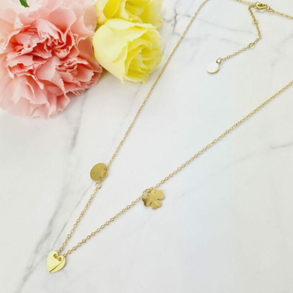 Naszyjnik Celebrytka kółko serce koniczyna Naszyjnik klasyczna trzy elementowa "Celebrytka" z przywieszkami: kółko, serce i koniczynka. Przywieszki przedzielone większymi kółeczkami (ogniwkami) - dzięki temu mogą być równomiernie rozmieszczone i nie przesuwają się. Łańcuszek zwany "celebrytką" to bardzo modny dodatek który szczególnie przypadł do gustu wielu kobietom. Delikatny łańcuszek w połączeniu z subtelnymi zawieszkami stał się bardzo popularny wśród gwiazd ekranu, wybiegów mody czy mediów społecznościowych. Wykonany z wysokiej jakości stali chirurgicznej 316L zwanej także nierdzewną lub szlachetną. Stal chirurgiczna 316L: ❤ nie zmienia koloru ❤ nie uczula ❤ nie reaguje z wodą!! Można jej praktycznie nie zdejmować. Biżuteria pozłacana (platerowana) 18k złotem oraz zabezpieczona lakierem jubilerskim który nadaje piękny połysk i zabezpiecza złocenie. Wymiary: długość całkowita łańcuszka 44 cm. Możliwość zapięcia na 44, 43, 41 oraz 39cm. Przywieszki wielkości ok. 1 cm. Biżuteria jest antyalergiczna. Swój blask i kolor zachowa przez długi czas!! Świetna jakość wykonania.