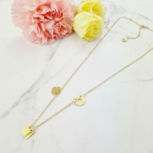 Naszyjnik Celebrytka koniczyna kwadrat kółko Naszyjnik klasyczna trzy elementowa "Celebrytka" z przywieszkami: koniczyna, kwadrat i kółko. Przywieszki przedzielone większymi kółeczkami (ogniwkami) - dzięki temu mogą być równomiernie rozmieszczone i nie przesuwają się. Łańcuszek zwany "celebrytką" to bardzo modny dodatek który szczególnie przypadł do gustu wielu kobietom. Delikatny łańcuszek w połączeniu z subtelnymi zawieszkami stał się bardzo popularny wśród gwiazd ekranu, wybiegów mody czy mediów społecznościowych. Wykonany z wysokiej jakości stali chirurgicznej 316L zwanej także nierdzewną lub szlachetną. Stal chirurgiczna 316L: ❤ nie zmienia koloru ❤ nie uczula ❤ nie reaguje z wodą!! Można jej praktycznie nie zdejmować. Biżuteria pozłacana (platerowana) 18k złotem oraz zabezpieczona lakierem jubilerskim który nadaje piękny połysk i zabezpiecza złocenie. Wymiary: długość całkowita łańcuszka 44 cm. Możliwość zapięcia na 44, 43, 41 oraz 39cm. Przywieszki wielkości ok. 1 cm. Biżuteria jest antyalergiczna. Swój blask i kolor zachowa przez długi czas!! Świetna jakość wykonania.