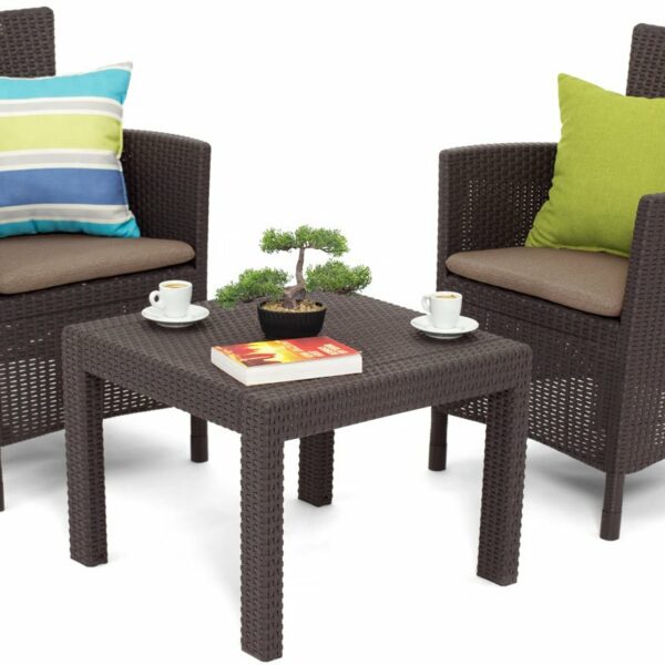 Balkonowy zestaw Rosario firmy Keter składa się z dwóch foteli i stoliczka kawowego. Głęboki kolor brązu oraz brązowe poduszki w zestawie idealnie wpasowują się w otaczającą przestrzeń balkonów i ogrodu. Struktura imitująca rattan nadaje meblom charakteru
