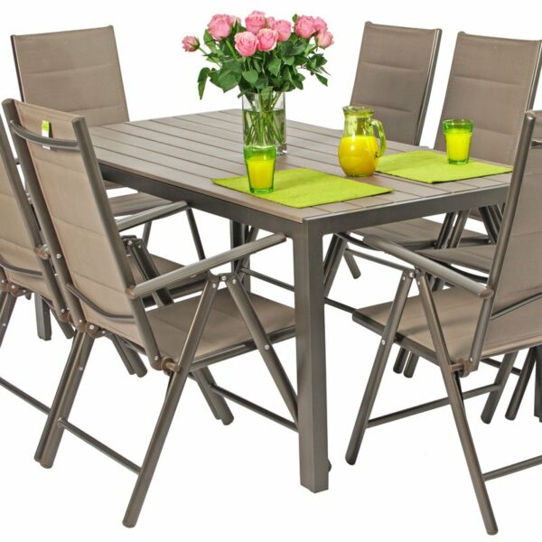 Brązowy zestaw tarasowy Modena MAX przeznaczony jest dla dużej rodziny. Przy dużym 180 cm stole mieści się 8 osób. Komfort i wygodę zapewniają krzesła z regulowanymi oparciami. Bardzo estetyczny i niebanalny zestaw mebli aluminiowych na taras.