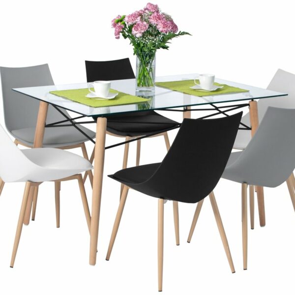 Wygodny i nowoczesny komplet mebli przeznaczonych do kuchni, jadalni, salonu lub kawiarni. Zestaw mebli jadalnianych składających się ze stołu 120 cm z blatem ze szkła hartowanego oraz z 6 wyjątkowo wygodnych krzeseł z poduszkami.