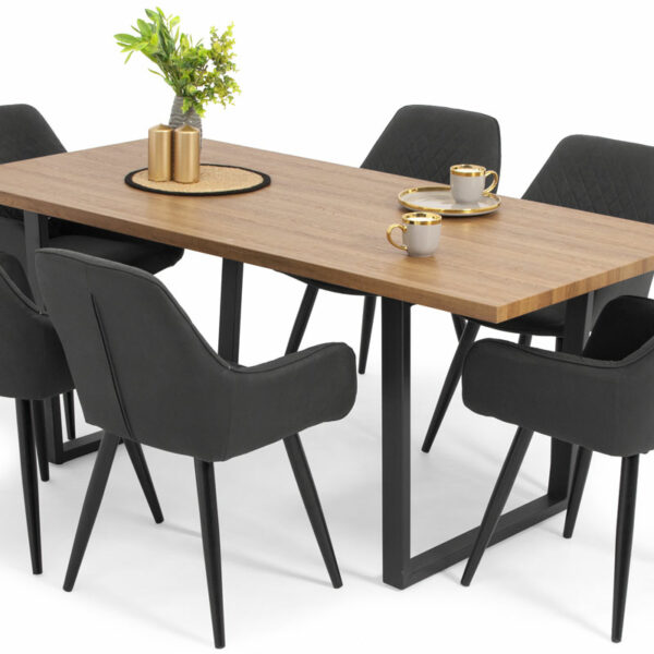 Stół i krzesła w nowojorskim stylu z charakterystycznymi elementami dla stylu loftowego. Czarne, metalowe nogi zarówno w grafitowych fotelach Emma jaki w drewnopodobnym stole Baltimore. Materiał na siedziskach to imitacja naturalnej skóry- nubuku.