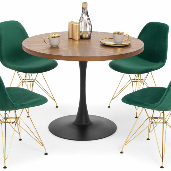 Piękny komplet 4-osobowy do jadalni: stół z okrągłym blatem i cztery welurowe krzesła ze złotymi nogami. Stół okrągły o średnicy 100 cm stojący na jednej nodze. Tapicerowane krzesło z metalowymi nogami obite butelkowo-zielonym materiałem typu velvet.