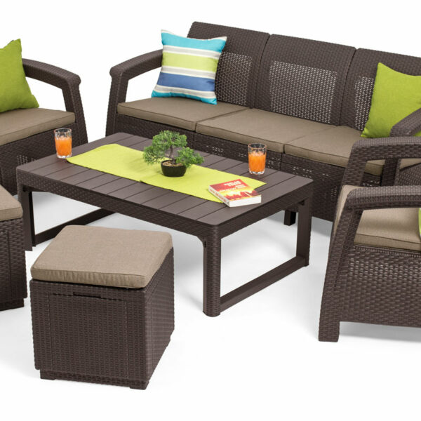 Ekskluzywny komplet mebli ogrodowych balkonowych z tworzywa plastikowego: duża kanapa 3-osobowa, fotel ogrodowy x 2szt., dwie pufy ze schowkiem i stół kawowy/jadalniany 2w1 z rozkładanymi nogami. Meble tarasowe z serii Corfu stworzone przez markę Keter.