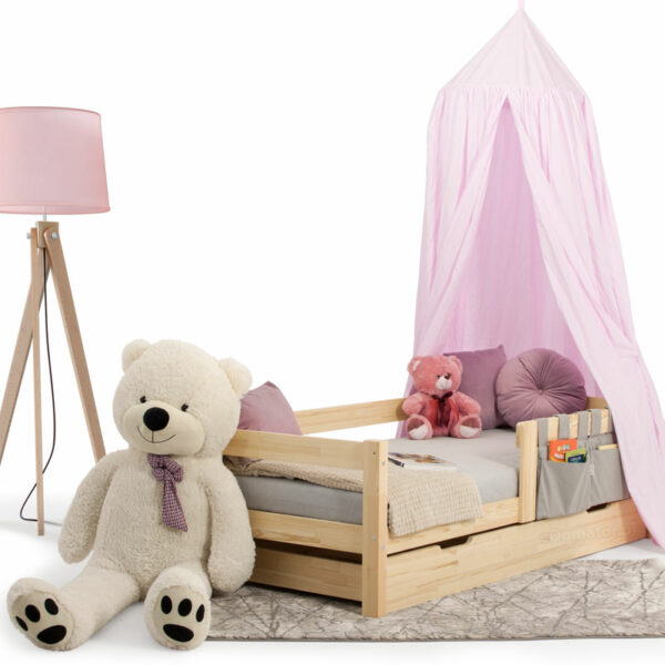 Drewniane łóżko do pokoju dziecięcego z pięknym różowym baldachimem, uroczymi dodatakmi na książki lub zabawki, a także z bardzo wygodnym, antyalergicznym materacem. Bogata wersja łóżeczka dla dziewczynki, dla przedszkolaka