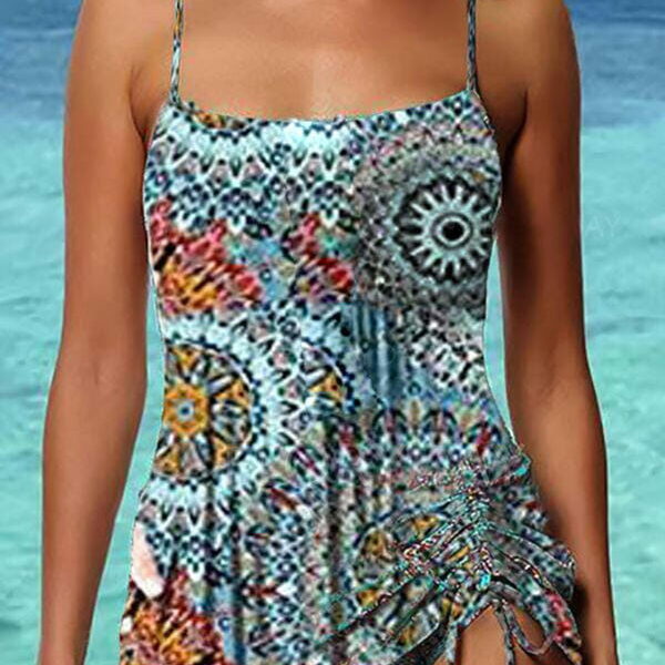 Tankini dekolt u na ramiączkach sznurowany ściągacz węzeł marszczenie na gumce nadruk lato styl boho zielony
