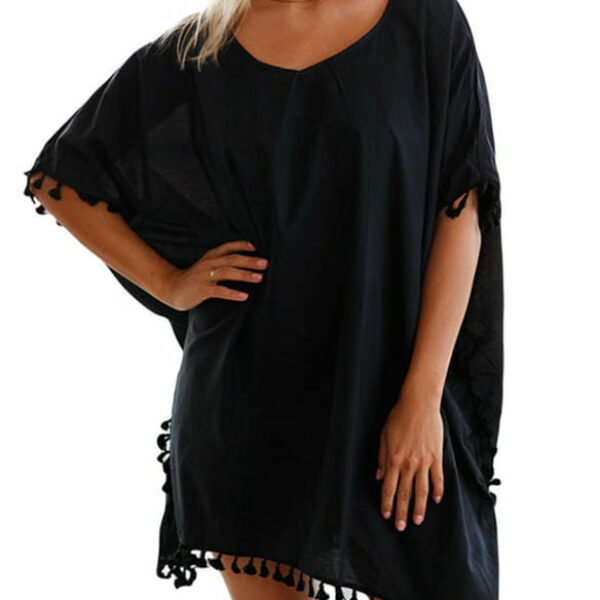 Kimono ponczo sukienka styl elegancki dekolt okrągły frędzel jednolity czarny