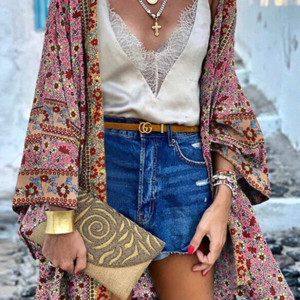 Kimono dekolt okrągły połączone kolory w paski styl boho styl retro różowy